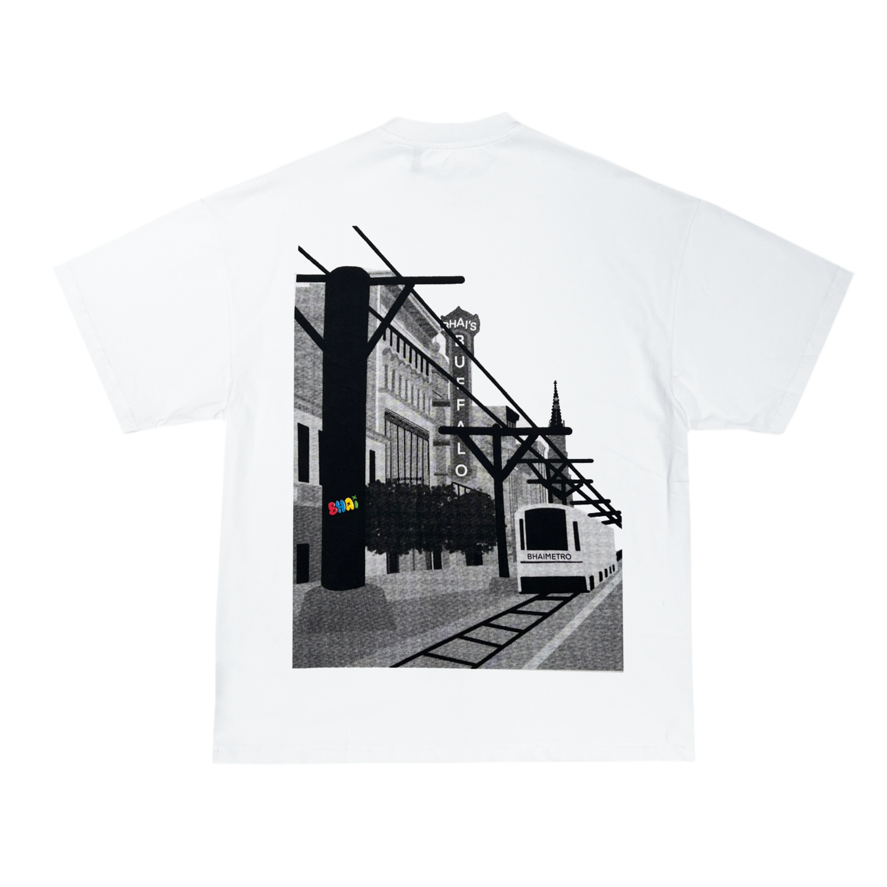 THE FRONT SHOWCASES OUR SIGNATURE BHAI STICKER LOGO BOLDLY “SLAPPED” ALONG THE SIDE, WHILE THE BACK DISPLAYS A HALFTONE ILLUSTRATION OF BUFFALO’S ICONIC DOWNTOWN THEATER DISTRICT