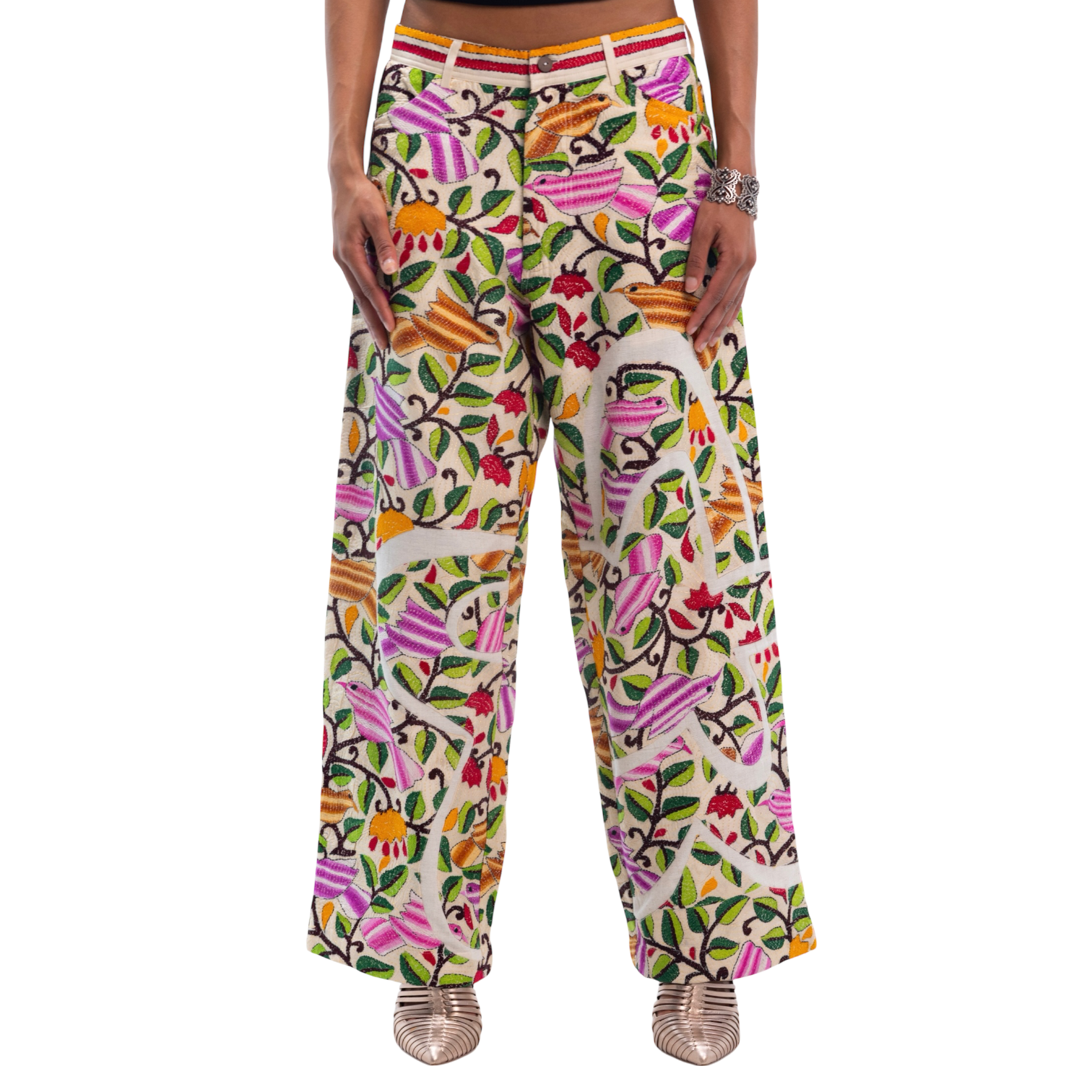 DOUBLE-KNEE PANTS FEATURING KANTHA CHIDIYA (BIRD) PATTERN