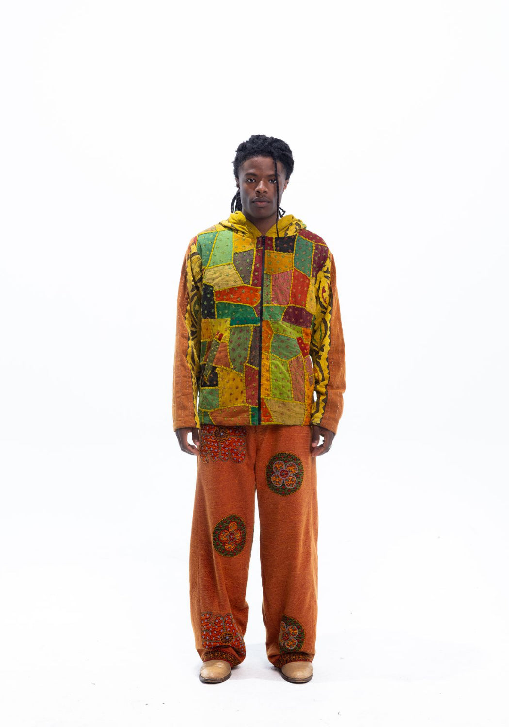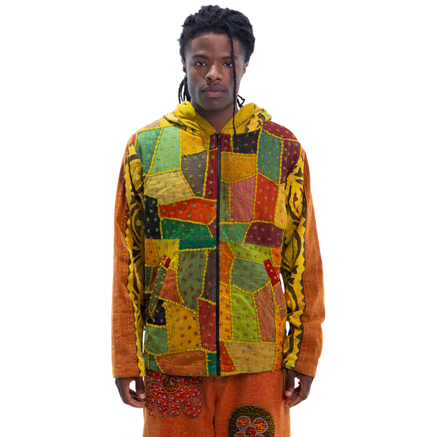 1 OF 1 HOODED COTTON JACKET FEATURING HAND EMBROIDERY, KANTHA, AND INTRICATE APPLIQUÉ PATTERNS. FITS OVERSIZED