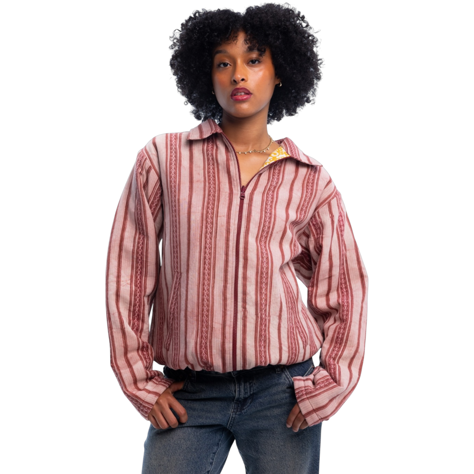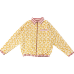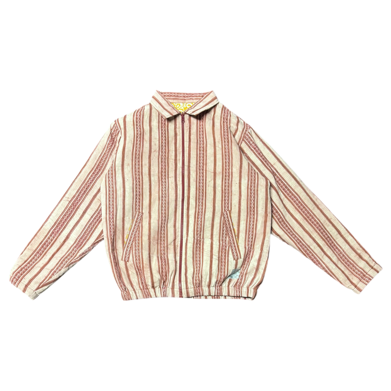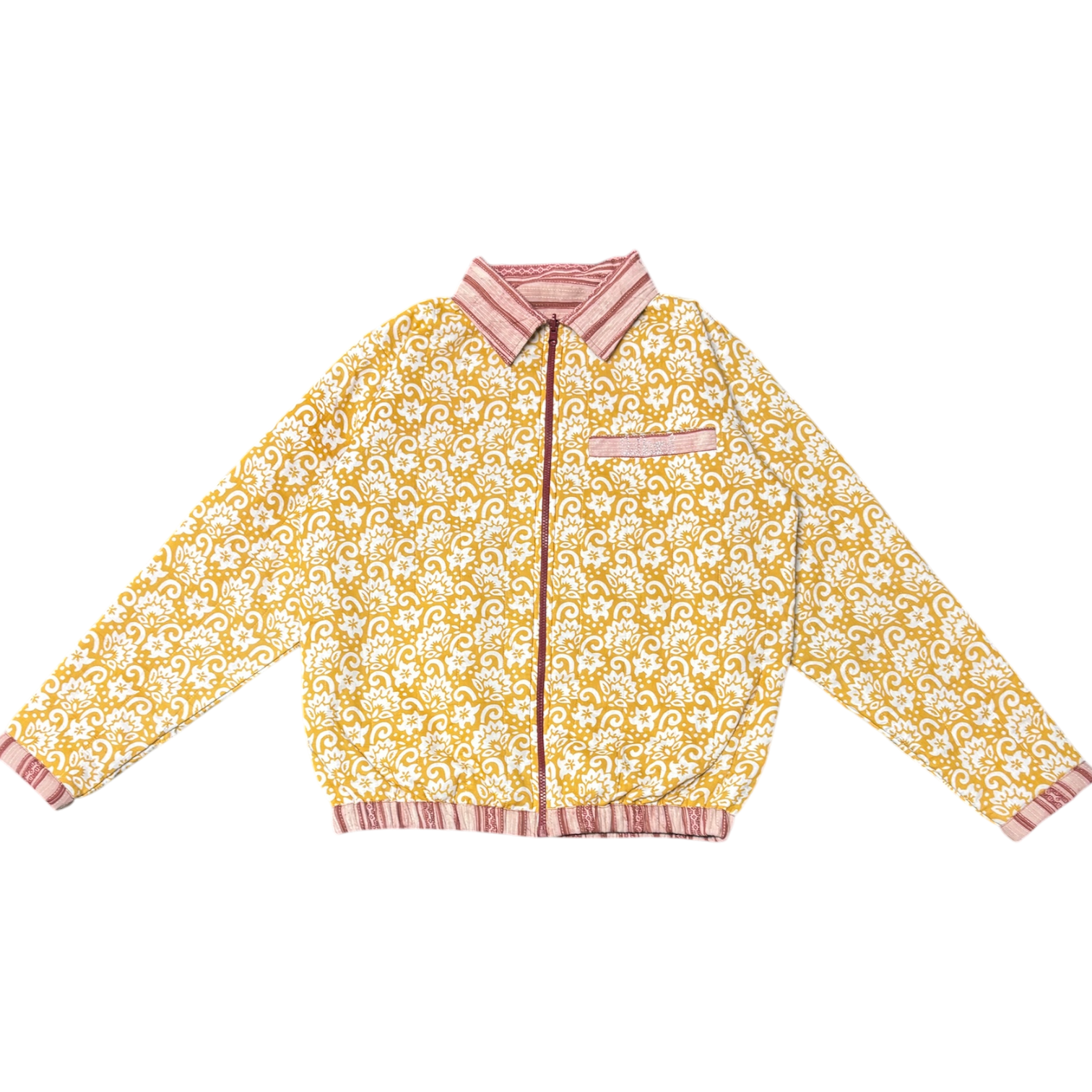 Kantha refers embroidery pattern used to create unique textiles; Kantha fabrics are characterized by a series of small, straight running stitches. The exterior face of this 1-of-1 reversible jacket is an intricate red kantha fabric which has been quilted, then sealed on the interior with a vibrant yellow block-printed cotton.